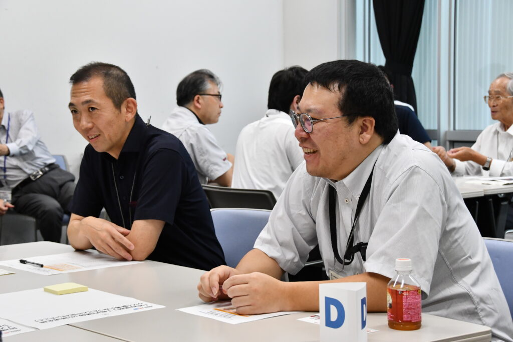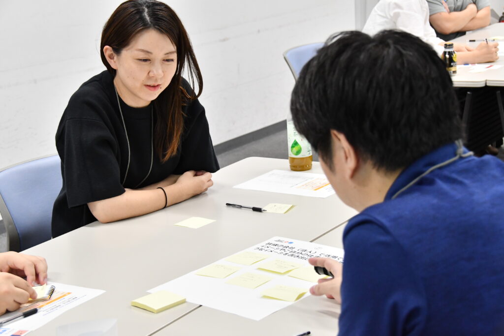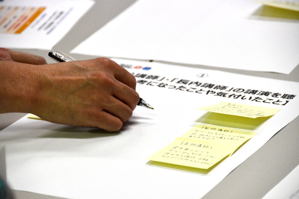 配布されたA3の用紙に気付きメモを付箋に記載して貼る作業などを行いました。アンケートにも異業種の方との交流や意見交換が参考になったとの評価もいただきました。