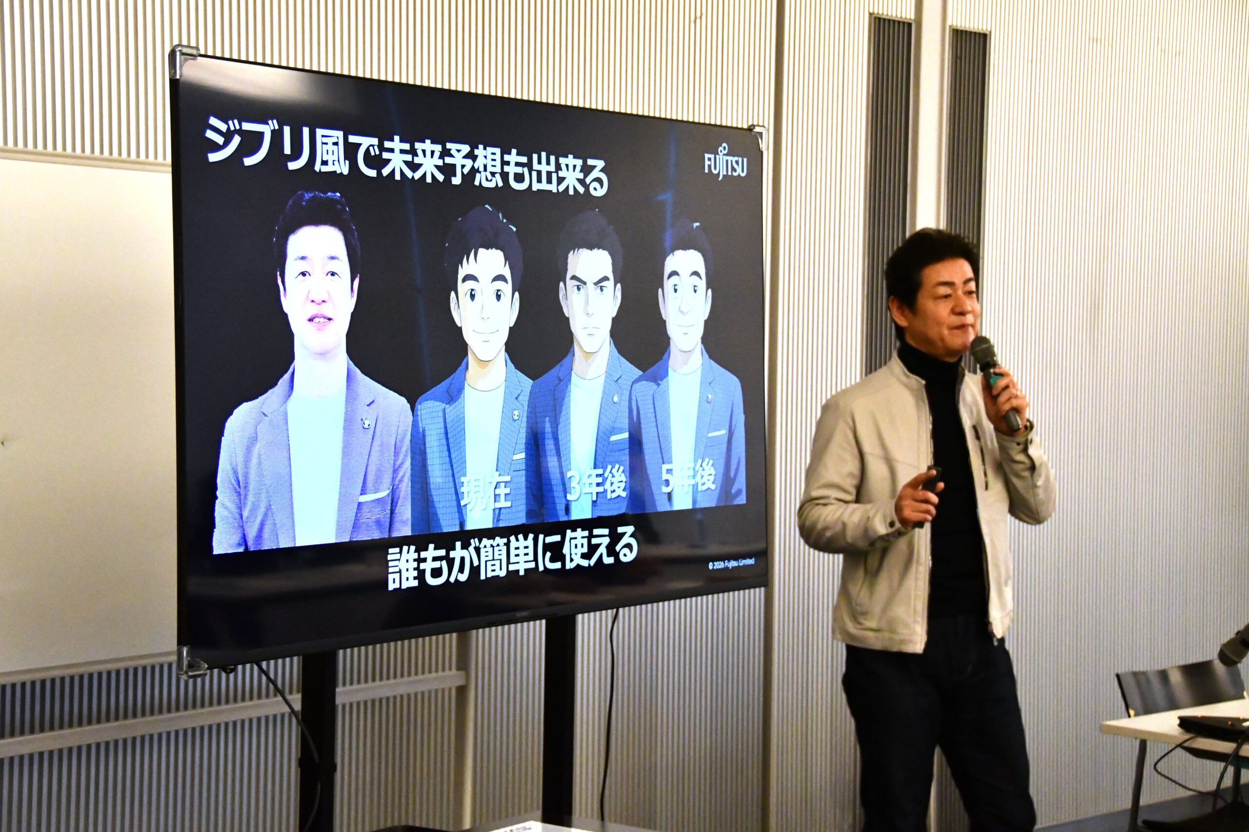 講師は富士通株式会社のシニアエバンジェリスト武田幸治様です。テーマは『生成AIが現場を変える! ~最前線で起こっていること~』で、年間120本ほどの講演を全国各地で展開されている武田様の講演は、スムーズな流れとビジュアルで訴求力のある資料が特徴的です。