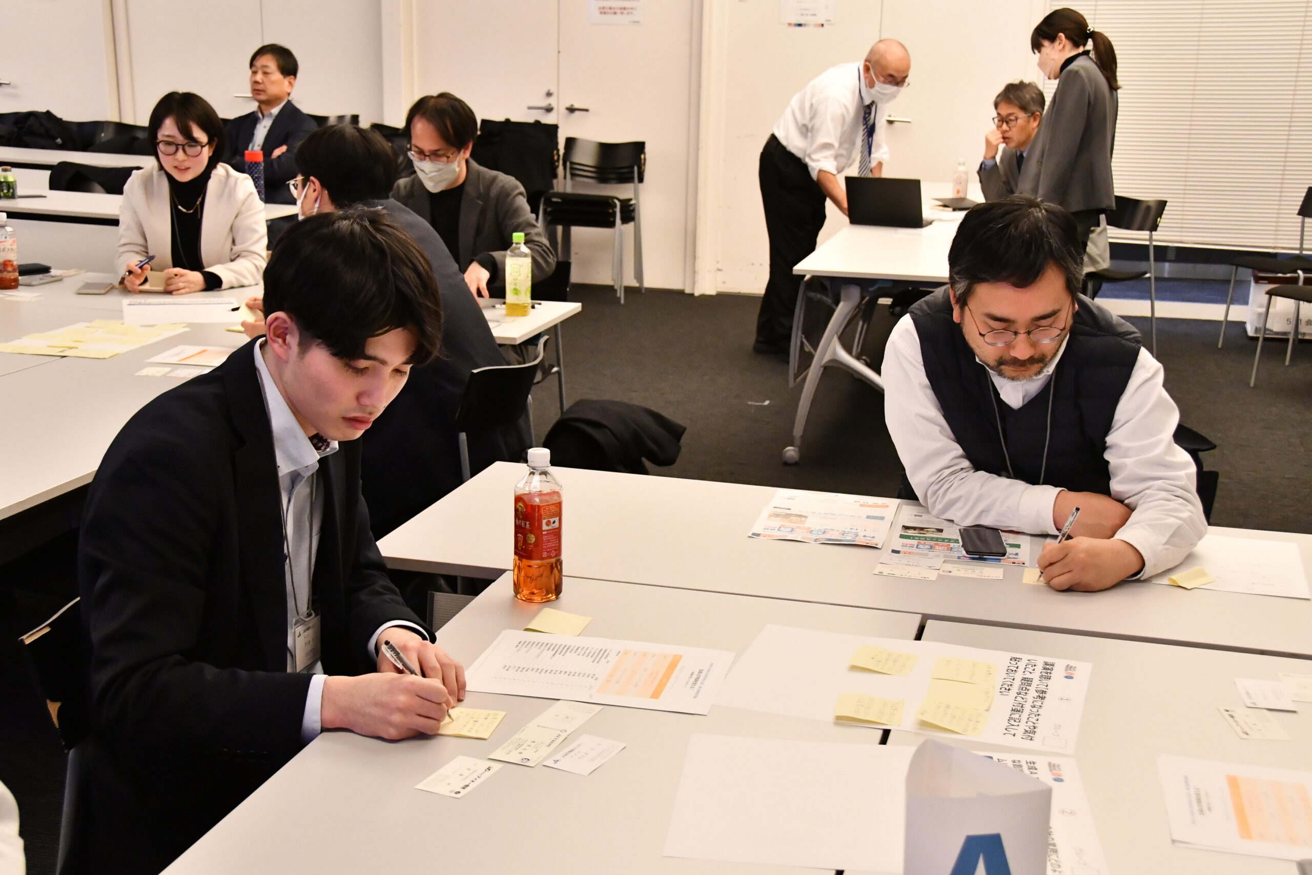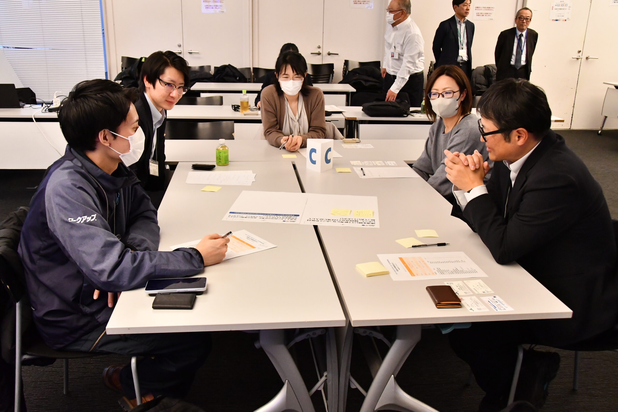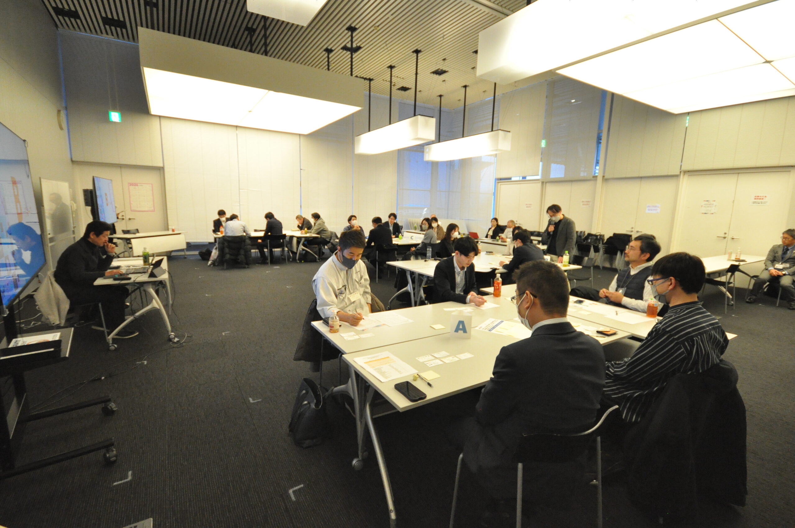会場では参加者がスマホを使って講演中にアンケートに回答し、その結果をリアルタイムに表示するテクニックも活用されています。グループワークでは4つのグループに分かれて活発な意見交換を実施しました。各グループで気づいたことを付箋に書いて用紙に貼ったものを、講師がスマホで撮影し、生成AIに読み込ませて資料化して表示する場面では、参加者から驚きと感心の声が上がっていました。